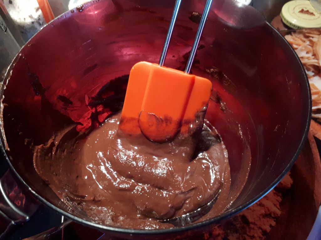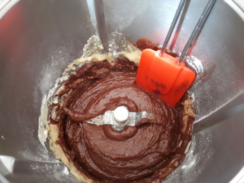- Ajouter le chocolat fondu et le mélange noisettes, levure et farine.