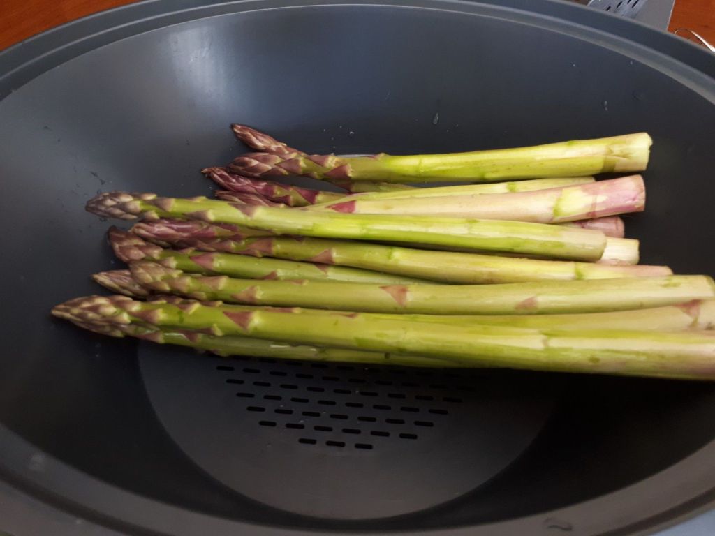 - Couper la base des asperges vertes. Les laver. Faire bouillir de l’eau salée dans une casserole, quand elle bout y plonger les asperges vertes pendant 4-5 min. Quand les asperges sont assez tendres mais pas trop (piquer avec un couteau pour vérifier la cuisson) les égoutter.