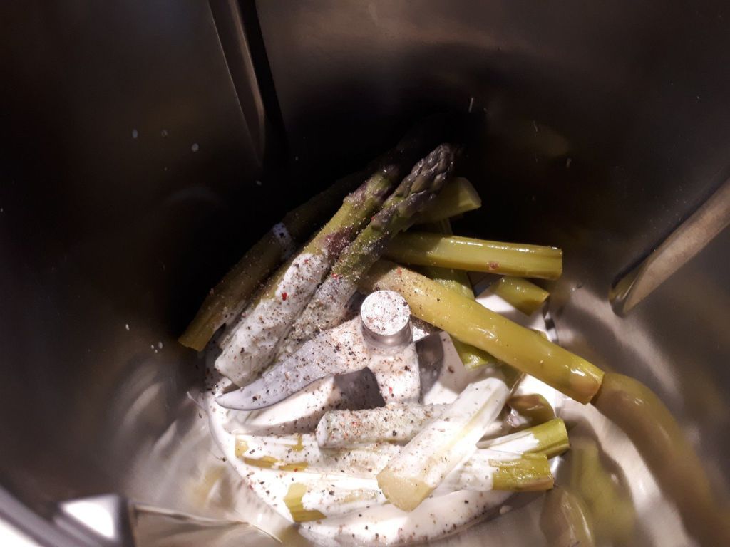 - Lorsque les asperges sont froides, couper les pointes en laissant une longueur d’environ 7-8 cm réserver quelques pointes ( 3 par bocal). Mettre le reste des tiges dans le bol rincé du Thermomix, avec la crème liquide, le sel et le poivre puis mixer 10sec/vit6.