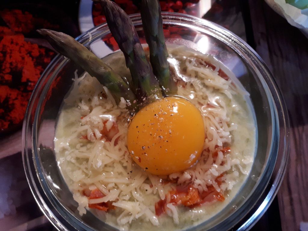- Dans des petits bocaux répartir le velouté d’asperges vertes, ajouter un peu de chiffonnade de chorizo, du fromage râpée, casser délicatement un œuf frais ajouter les pointes d’asperge. Poivrer, saler légèrement .