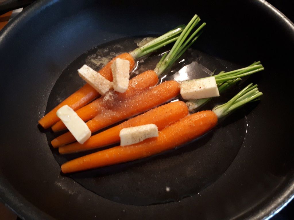 - Disposer les carottes dans une poêle. Ajouter le beurre coupé en morceaux et saupoudrer de sucre.