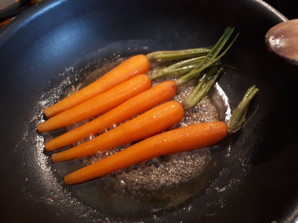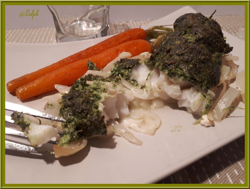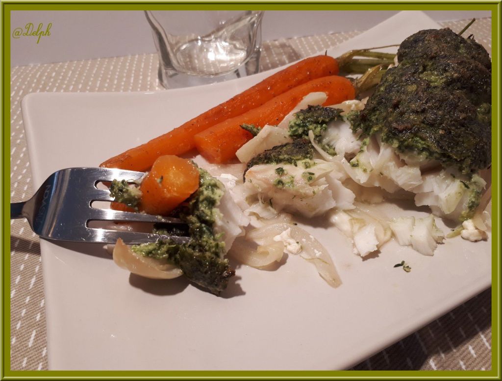 J’ai pioché la recette des carottes glacées chez « La cuisine du Jardin » qui nous a généreusement partagé la recette de de Joël Robuchon..C’est bon et super facile à réaliser. Ces carottes ont accompagné mon cabillaud, poisson que j’aime beaucoup..Voici une petite assiette pas très calorique mais très bonne, avec de bonnes saveurs. J’ai utilisé mon pesto de fanes de carottes mais vous pouvez utiliser un autre pesto à votre goût.