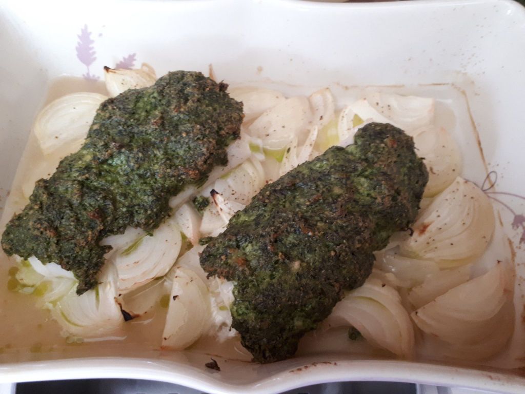 - Retirer votre plat puis déposer vos dos de cabillaud, recouvrir le poisson de pesto, puis enfourner pour 25 minutes (recouvrir le plat d’une feuille aluminium), au bout de ce temps, enlever la feuille d’aluminium et poursuivre la cuisson environ 5 minutes.