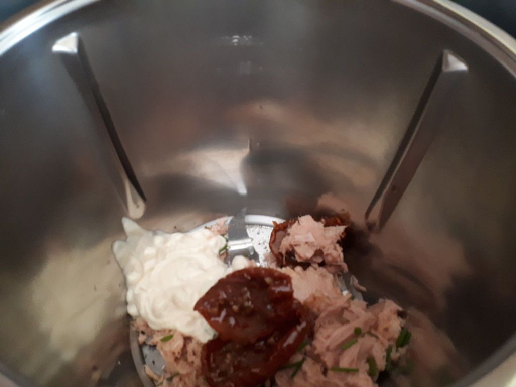 - Déposer dans le bol du Thermomix, tous les ingrédients ( sauf les pâtes) puis mixer 15sec/vit6, racler les bords avec la spatule, puis mixer 10sec/Vit5.