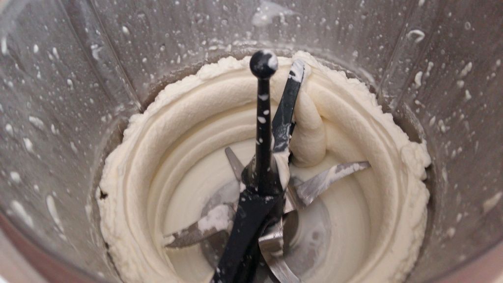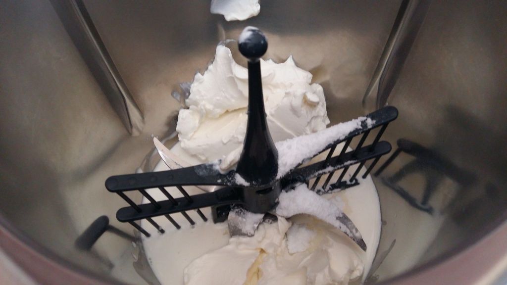 2. Insérer le fouet dans le bol, puis y déposer la crème, le sucre glace et le mascarpone, puis  fouetter 2min/Vit3. Enlever le fouet