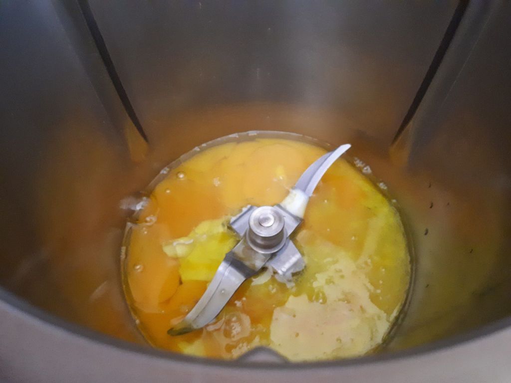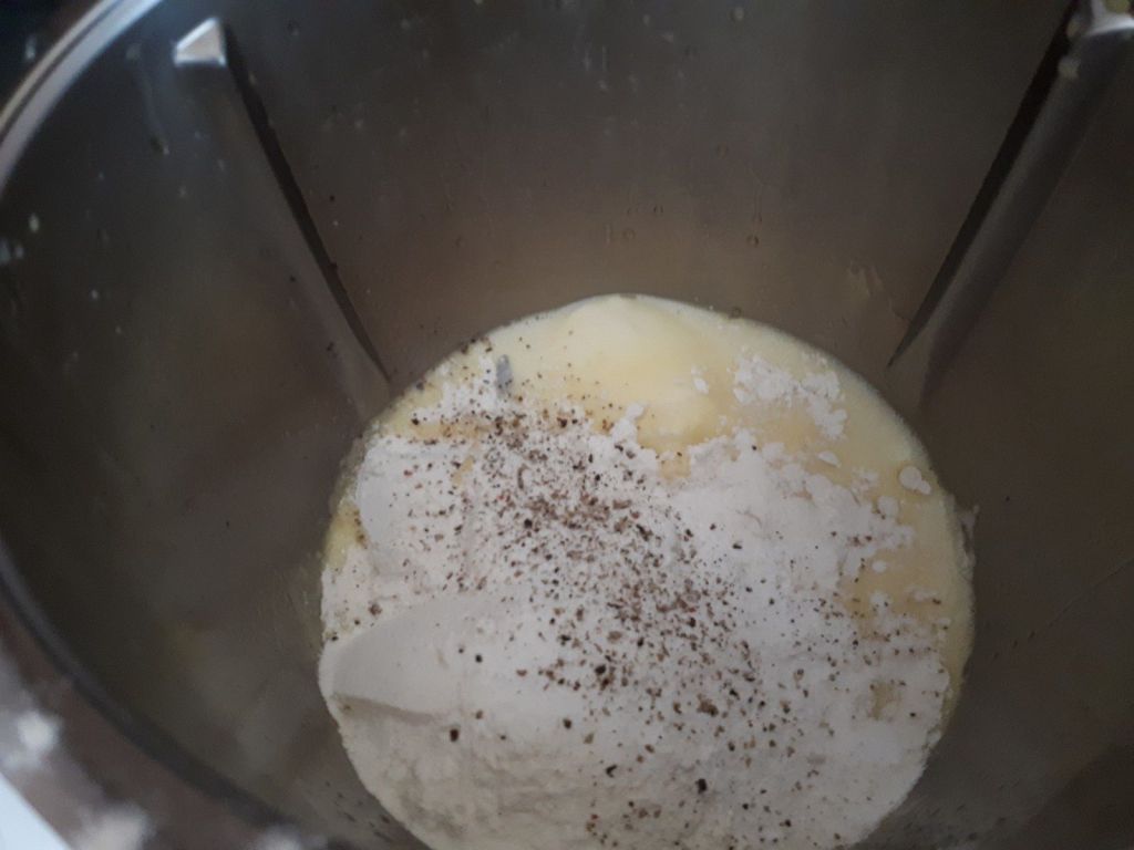 - Mettre dans le bol du Thermomix, vos œufs, les huiles , le lait puis mélanger 30sec/vit4, ajouter la farine, la levure et assaisonner puis mélanger 30sec/vit3.