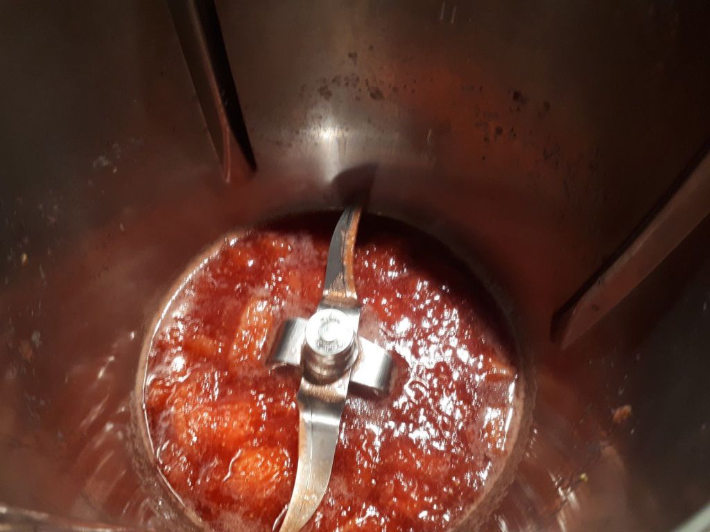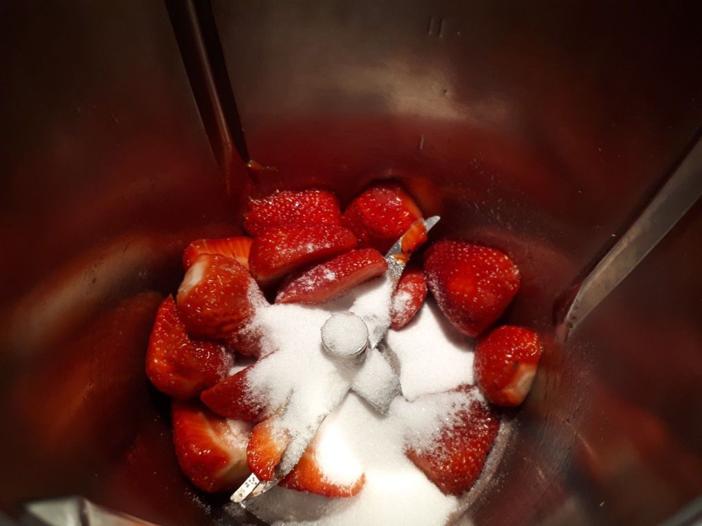 - Laver, éplucher les fraises les couper en deux les mettre dans le bol avec le sucre puis faire chauffer 4min/100°C/vit2, ajouter la gélatine essorée puis mixer 10sec/vit5.