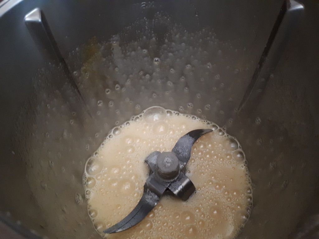 - Mettre les jaunes, l’extrait de vanille et le sucre puis fouetter 3 min/Vit2 toujours avec le fouet, ajouter la farine et la maïzena puis mélanger 30sec/Vit 2 avec le fouet, ajouter les blancs en neige et fouetter 50sec/Vit1 avec le fouet. A la sonnerie, donner quelques coups de spatule pour que toute la préparation soit bien mélangée.