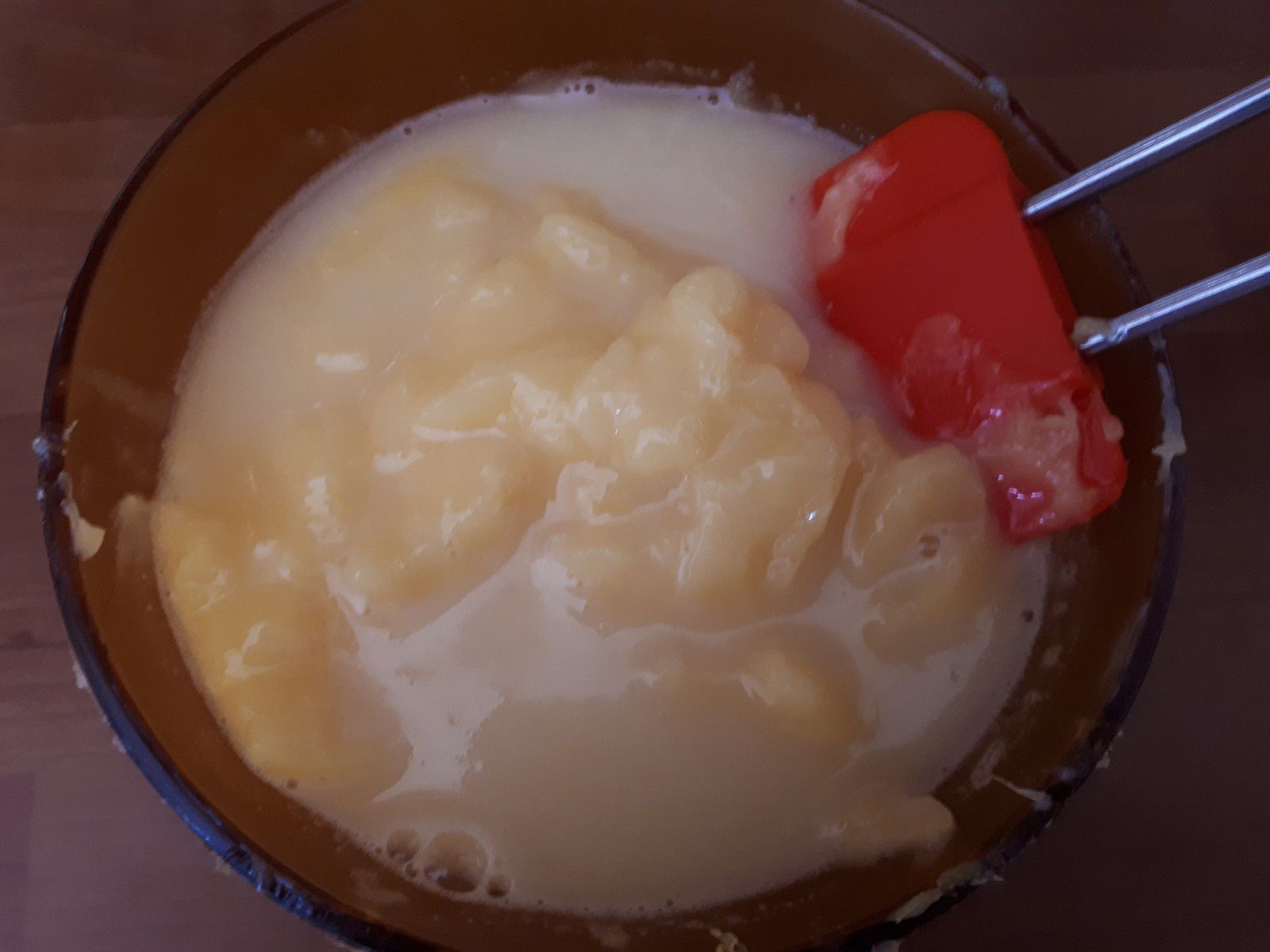 - Retirer du feu et ajouter la gélatine essorée.Puis ajouter le lait concentré et le chocolat blanc.Mélanger bien pour faire fondre le chocolat.