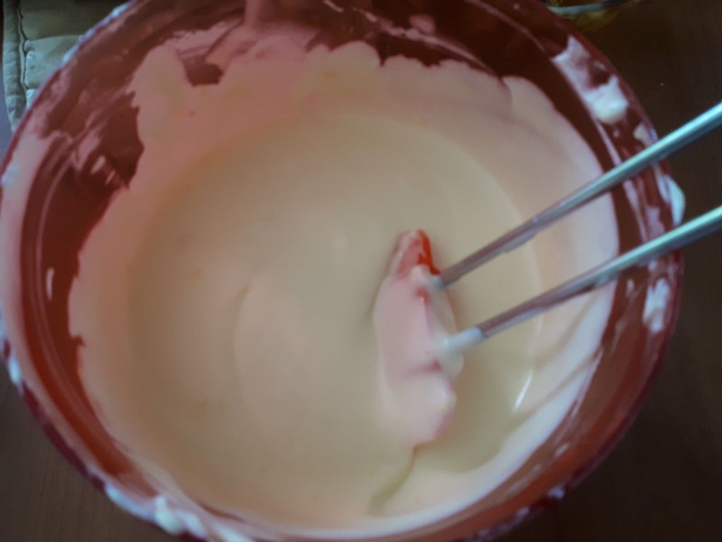 - Ajouter le colorant et mixer le tout au mixeur plongeant, en laissant bien le pied au fond du récipient pour ne faire faire trop de bulle .