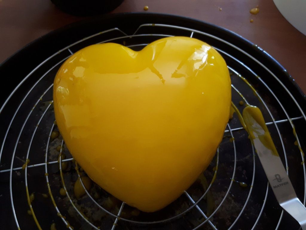 Veiller à ce que votre glaçage soit à 35° et couler le sur l’entremets d’un mouvement circulaire.
