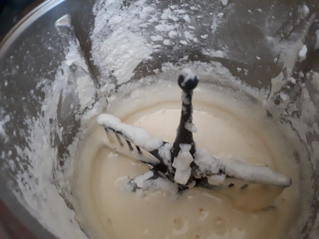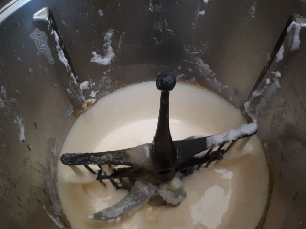 - A la sonnerie, ajouter le chocolat blanc et le lait concentré puis mélanger 2min /50°C / vit 2,5