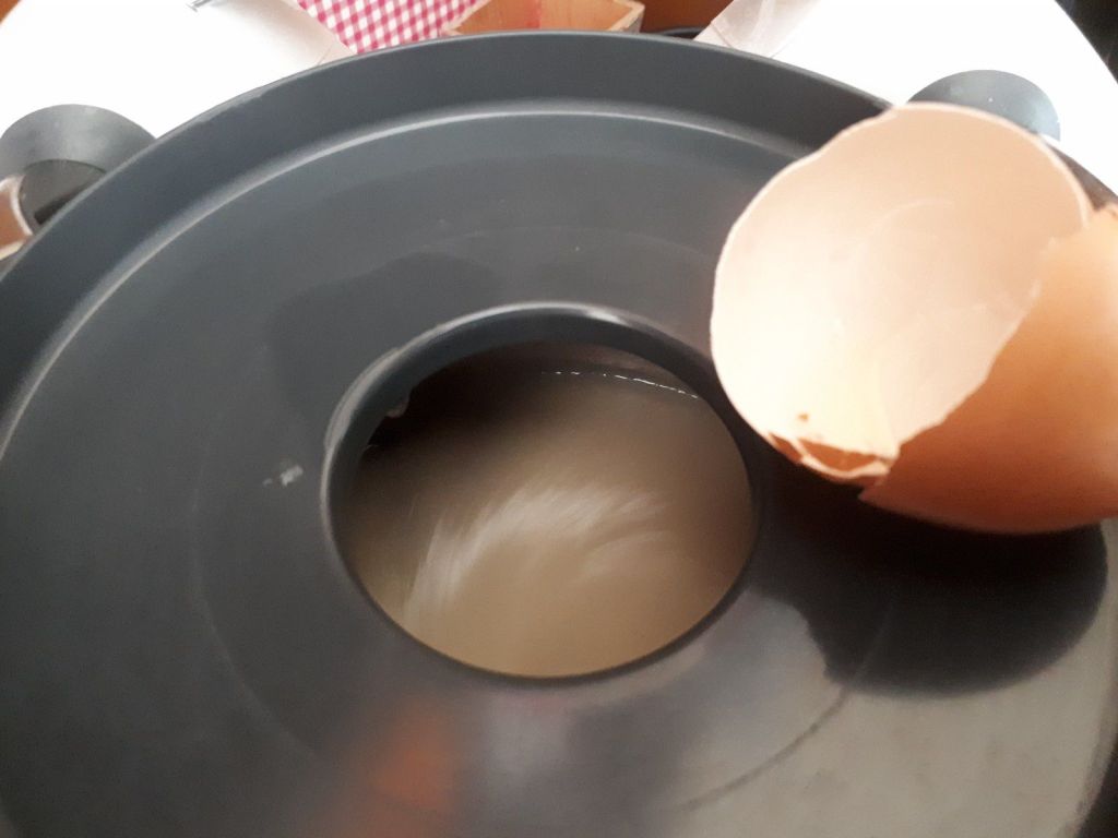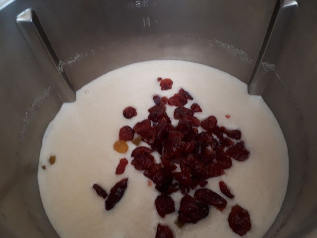 - Retirer le bol, et laisser refroidir une dizaine de minutes, remettre le bol en place, ajouter les raisins puis programmer 1min/couteau inversé/ Vit3, ôter le gobelet et mettre les œufs sur les couteaux en marche, laisser tourner la minute entière.