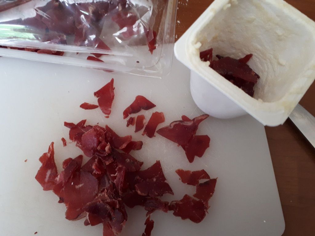 - Mélanger les ingrédients en les ajoutant dans l’ordre, couper le bœuf séché en petits bouts, égoutter et enlever l’huile de tomates et les couper en petits bouts également, bien mélanger le tout assaisonner et mettre le pesto de persil.