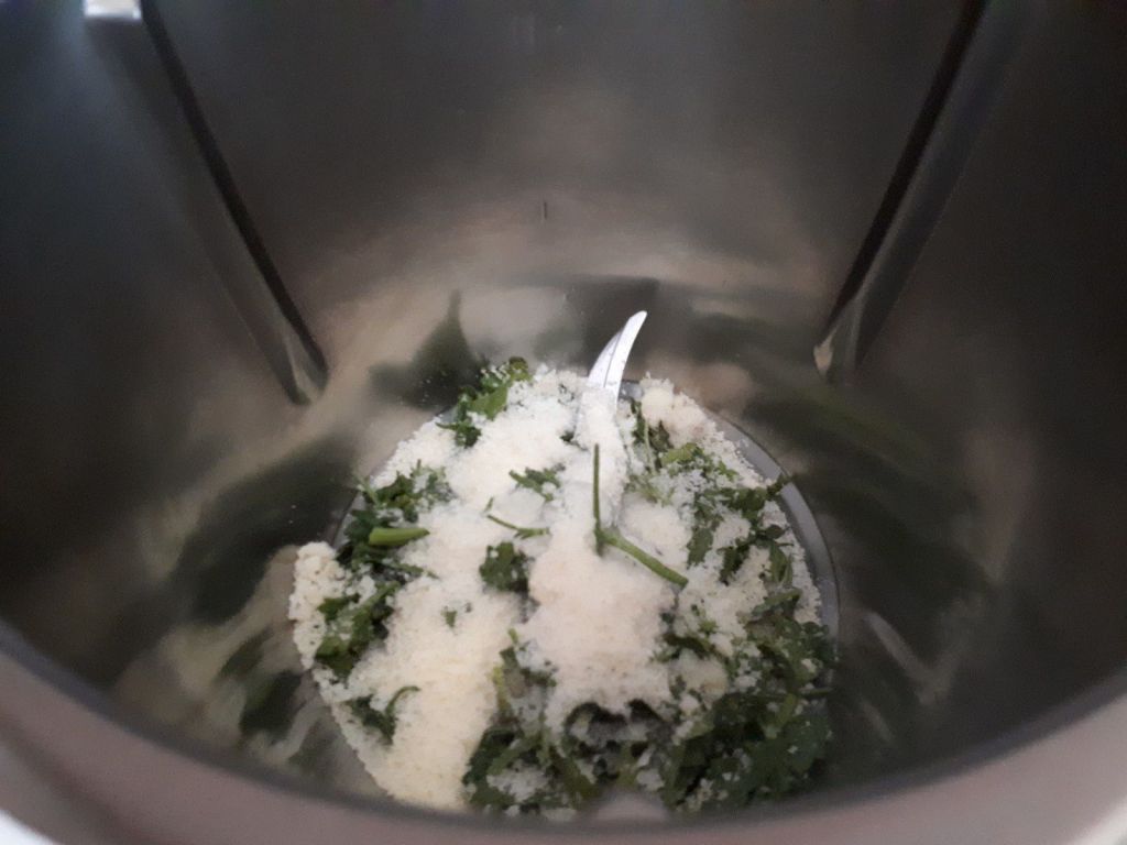 1. Dans le bol haut du mixeur plongeant, mettre le persil (il faut 15 grammes sans les grosses tiges), la poudre d’amandes, le parmesan, la gousse d’ail épluchée et coupée en morceaux, le sel et le poivre. Mixer afin de hacher tout l’ensemble.