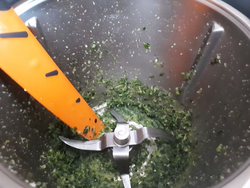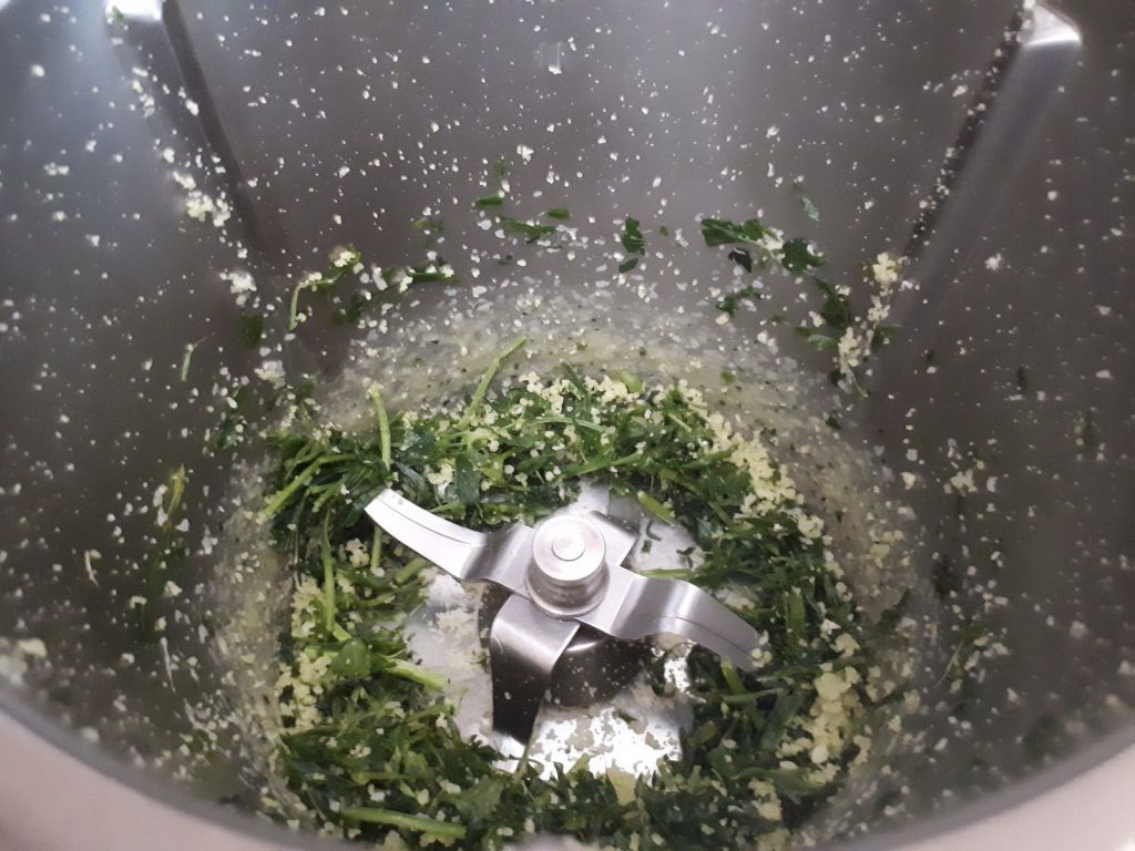 1. Dans votre Thermomix, mettre votre persil propre et grossièrement ciselé, la poudre d’amandes, le parmesan, la gousse d’ail épluchée, le sel et le poivre. Mixer 7sec/vit8. Racler les bords