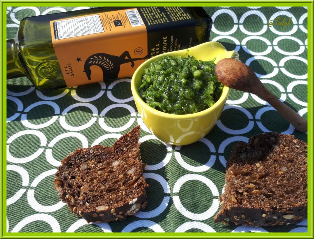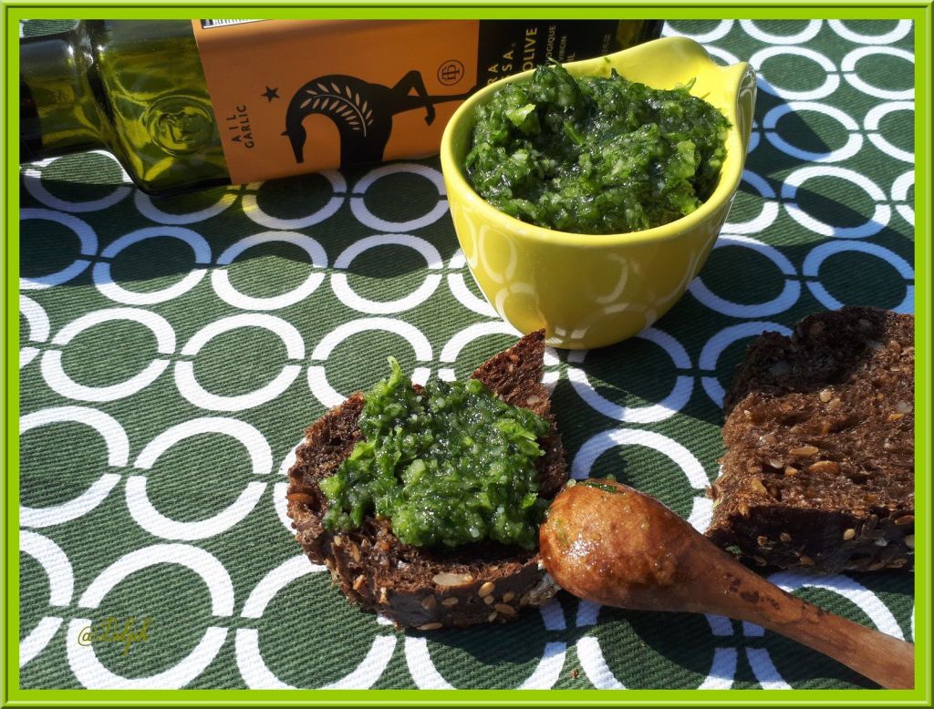 J’aime beaucoup le pesto, et comme j’avais du persil à utiliser j’ai tout de suite tester sa recette, je ne regrette pas il est très savoureux, tartiné en apéro sur des petites tranches de pain complet c’est un régal.