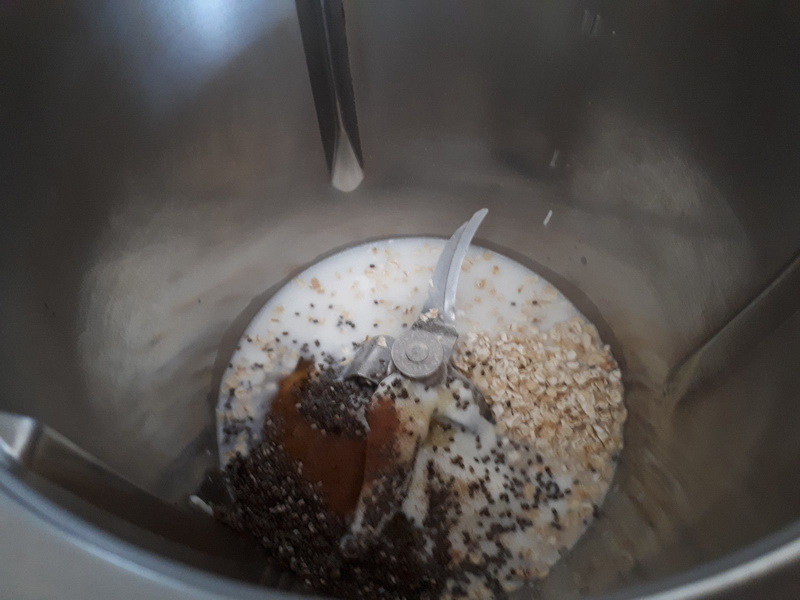 - Mettre le lait, les flocons d’avoine, le yaourt brassé, les graines de chia, le miel et la cannelle dans votre bol puis mélanger 25sec/couteau inversé/Vit2.