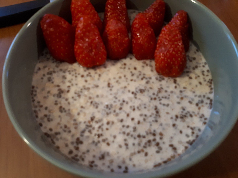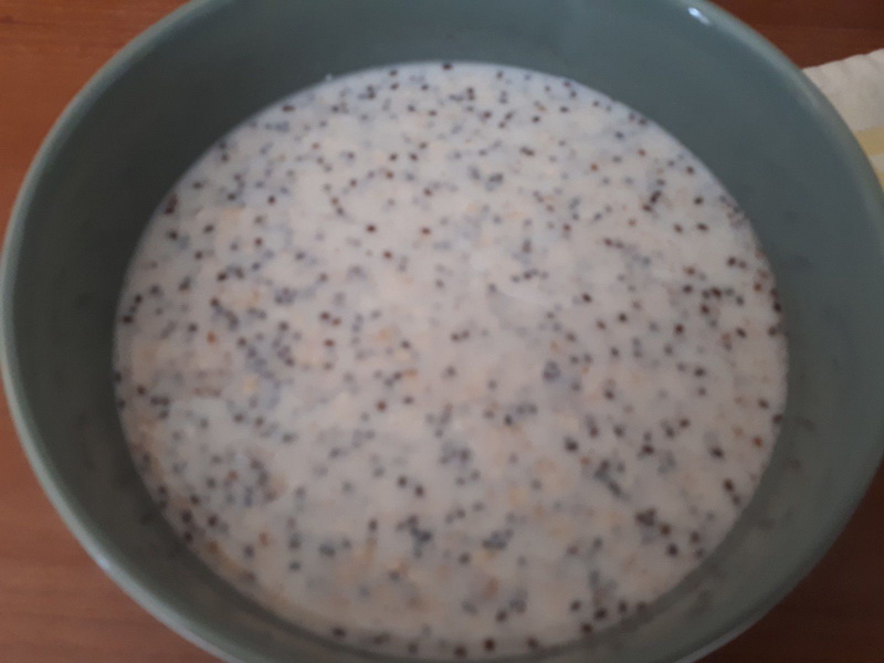 - Mélanger le lait, les flocons d’avoine, le yaourt brassé, les graines de chia, le miel et la cannelle dans un saladier.