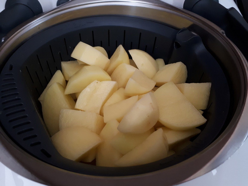 - Éplucher les pommes de terre et coupez-les en petits dés puis déposez-les dans le panier de cuisson.