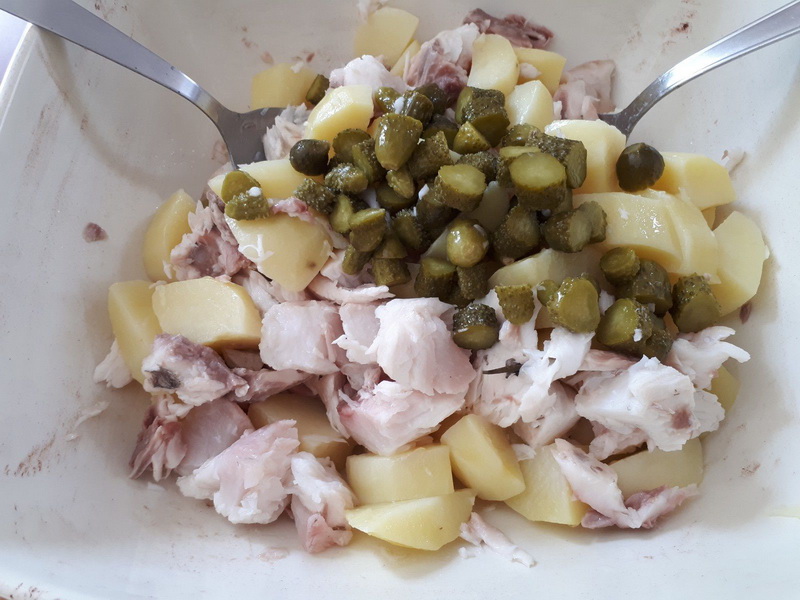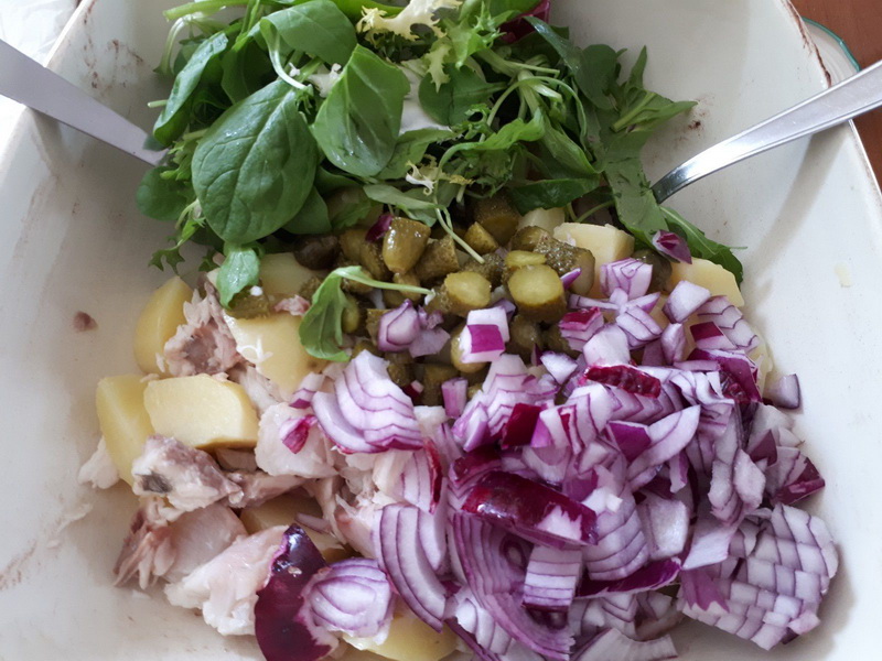 - Mettre dans votre saladier, les pommes de terre, les cornichons coupés en rondelles, votre oignon émincé et la poignée de salade, mélanger le tout.