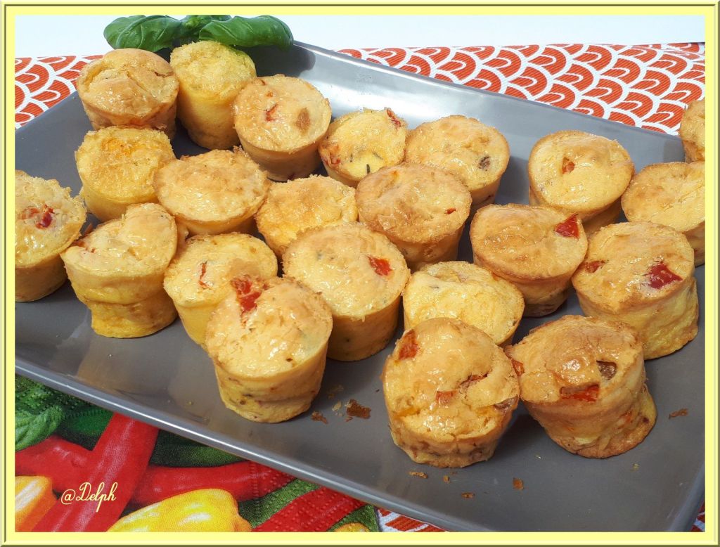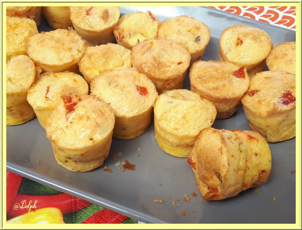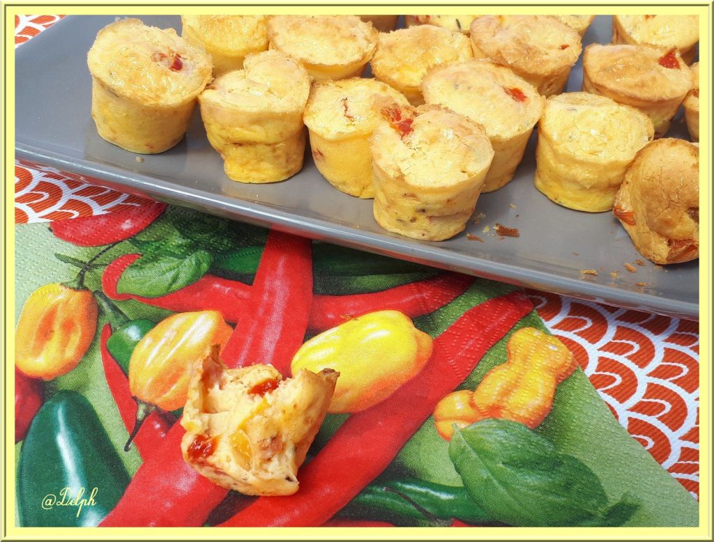 Vanessa a utilisé une préparation de poivrons marinés à l’Espelette, mais comme j’avais réalisé des poivrons marinés j’ai préféré utiliser les miens en ajoutant du piment d’Espelette. Ces petites bouchées sont très moelleuses, la prochaine fois, je mets un peu de Comté râpé dans mes préparation pour que cela soit un peu plus gourmand, je vous l’ajoute dans la liste des ingrédients. Merci Vanessa pour l’idée