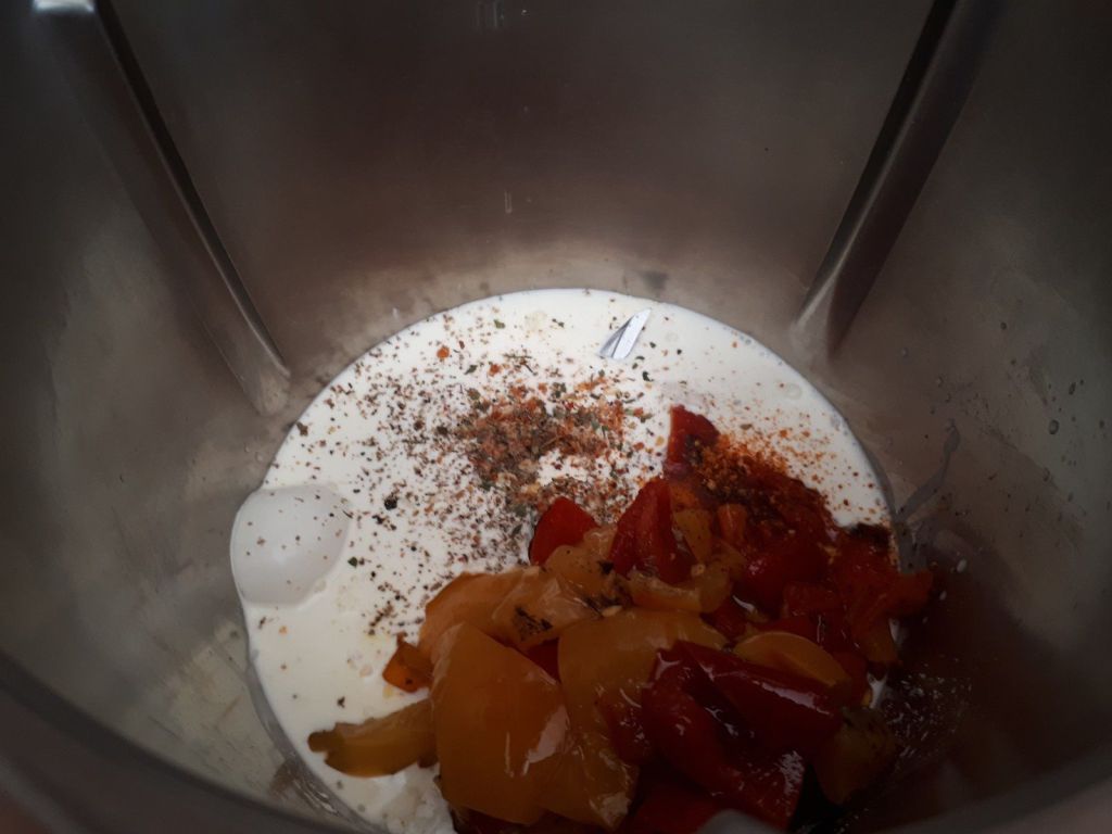 - Dans le bol mettre les œufs, la crème, la maïzena, le sel, le poivre, le piment d’Espelette les poivrons et le Comté râpé puis mélanger 30sec/couteau inversé/Vit3.