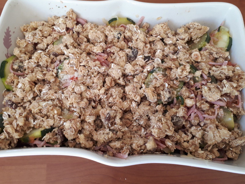 - Dans un plat à gratin légèrement huilé, verser la préparation aux légumes, ( vous pouvez enlever un peu de jus de cuisson) ajouter le râpé de jambon et la mozzarella, mélanger délicatement. Parsemer de pâte à crumble et enfourner 25 minutes jusqu’à ce que le tout soit bien doré.