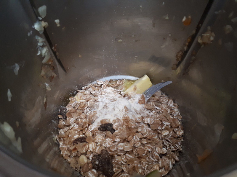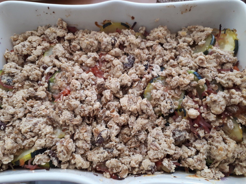 - Préparer la pâte à crumble, mettre le beurre en morceau, la farine et e muesli puis mixer 5sec/vit4,5. Parsemer de pâte à crumble vos légumes et enfourner 25 minutes jusqu’à ce que le tout soit bien doré.