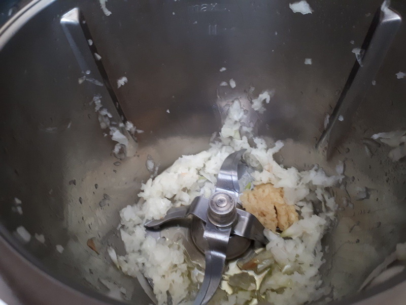 - Éplucher et couper l’oignon en deux le placer dans le bol et mixer 5sec/vit5, ajouter l’huile et la pâte d’ail et faire revenir 3min/90°C/Vit mijotage. Insérer le fouet.