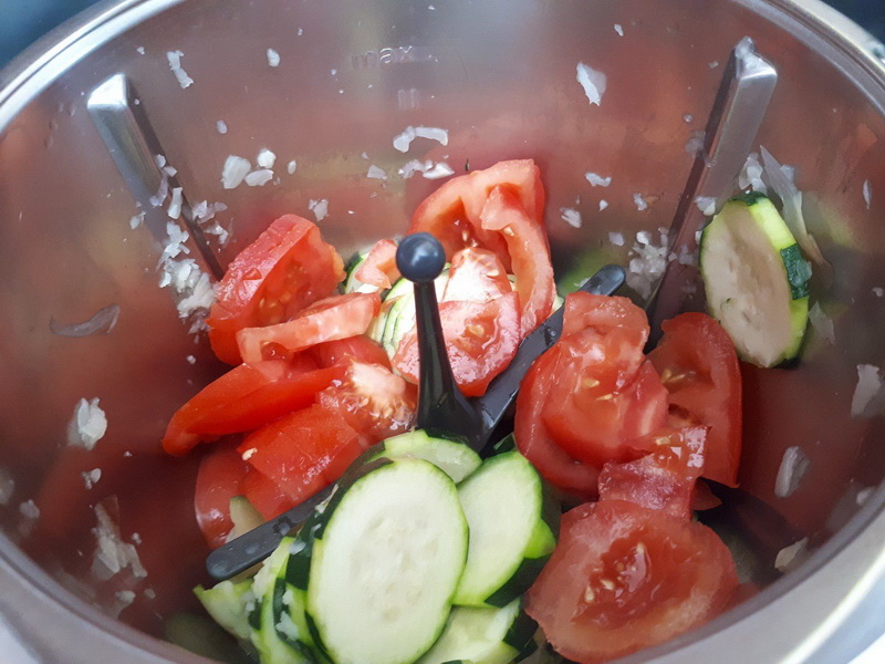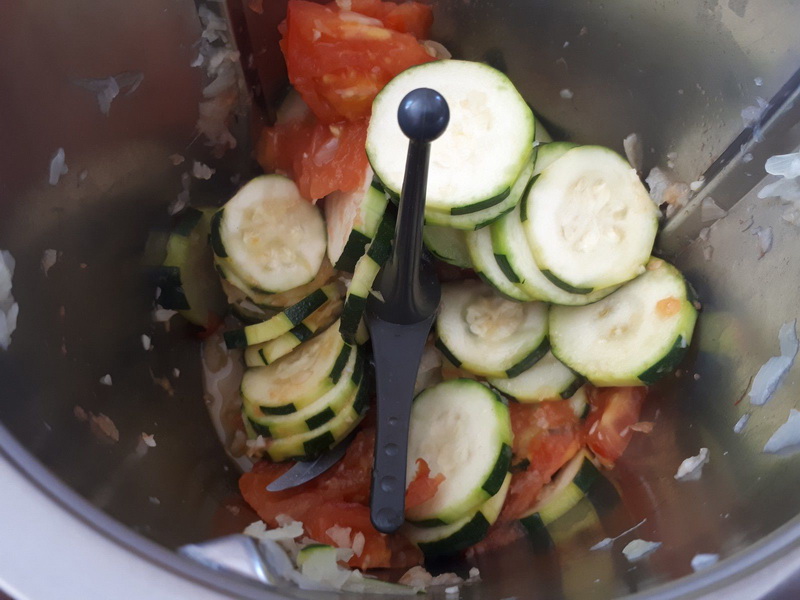 - Laver et couper les courgettes en rondelles, les ajouter aux oignons puis faire chauffer 10min/100°C/couteau inversé/Vit mijotage. A la sonnerie ajouter les tomates émondées et coupées en dés puis continuer la cuisson 5min/100°C/couteau inversé/vit mijotage.