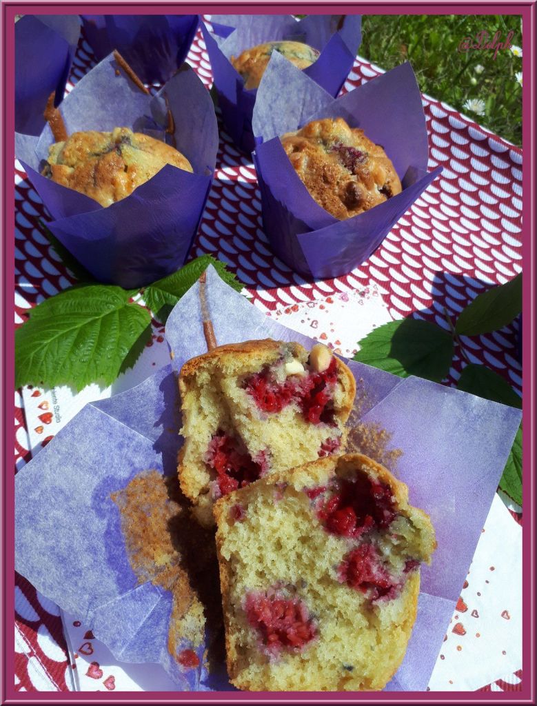 C’est Christelle de « La cuisine de poupoule » qui m’a donné envie de faire ces petits muffins. Il me restait quelques framboises, alors j’en ai profité.Ces muffins sont super moelleux merci Christelle, nous nous sommes régalés, j’ai ajouté un peu de chocolat blanc sur le dessus, pour plus de gourmandise.
