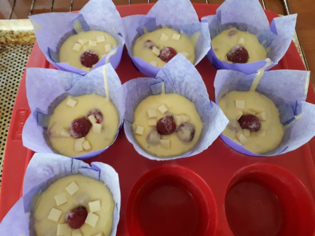 - Déposer sur le dessus de chaque muffin une framboise et quelques shuncks de chocolat blanc.