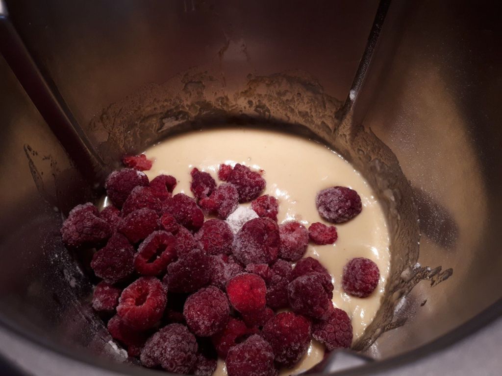 - Mettre tous les ingrédients dans le bol sauf les framboises et les shuncks et mixer 20sec/vitesse 3. Ajouter les framboises puis mélanger délicatement avec la spatule pour ne pas abimer les framboises.