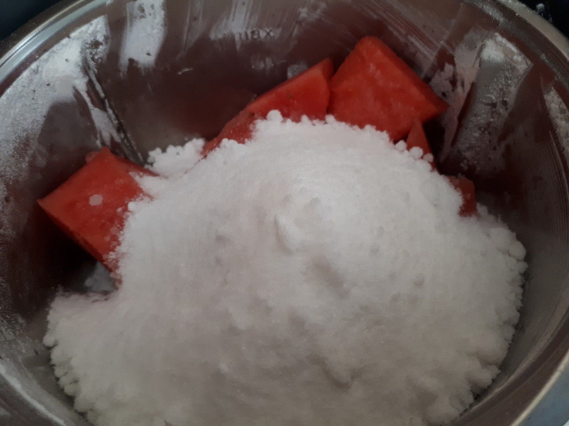 - Ajouter la pastèque, les 650 g de sucre restants et 10g de jus de citron puis cuire 20min/Varoma/Vit1 en remplaçant le gobelet doseur par le Varoma sans son couvercle pour éviter les projections.