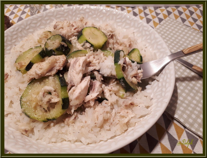 5. Pour dresser vos assiettes, je vous conseille de mettre un peu de riz, puis de servir les courgettes et le poisson avec un écumoire pour enlever le jus de cuisson..Mettre le jus à disposition pour se servir en fonction de ses goûts..