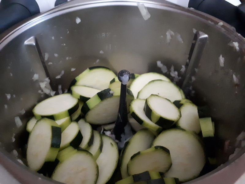 2. Laver et éplucher vos courgettes, les couper en fines rondelles, insérer le fouet dans le bol puis répartir les courgettes tout autour, assaisonner avec du sel, du poivre et le gingembre et programmer 12 min/100°C/couteau inversé/vit mijotage.
