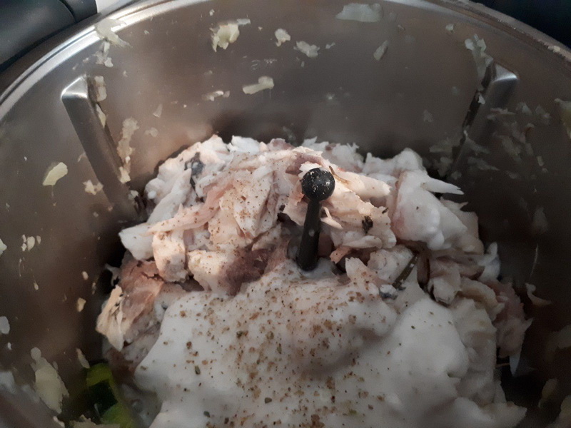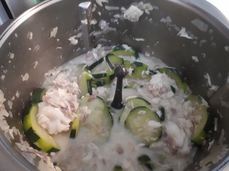 4. A la sonnerie du Thermomix, ajouter le poisson coupé en gros dés (j’ai coupé un peu trop petit, mon poisson s’est effiloché) et le lait de coco puis poursuivre la cuisson 3min/100°C/couteau inversé/vit mijotage.