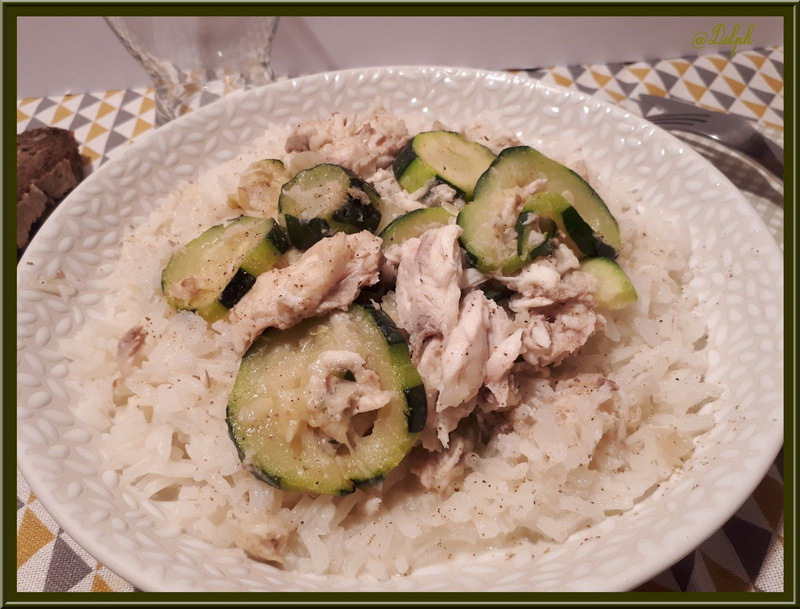5. Pour dresser vos assiettes, je vous conseille de mettre un peu de riz, puis de servir les courgettes et le poisson avec un écumoire pour enlever le jus de cuisson..Mettre le jus à disposition pour se servir en fonction de ses goûts..