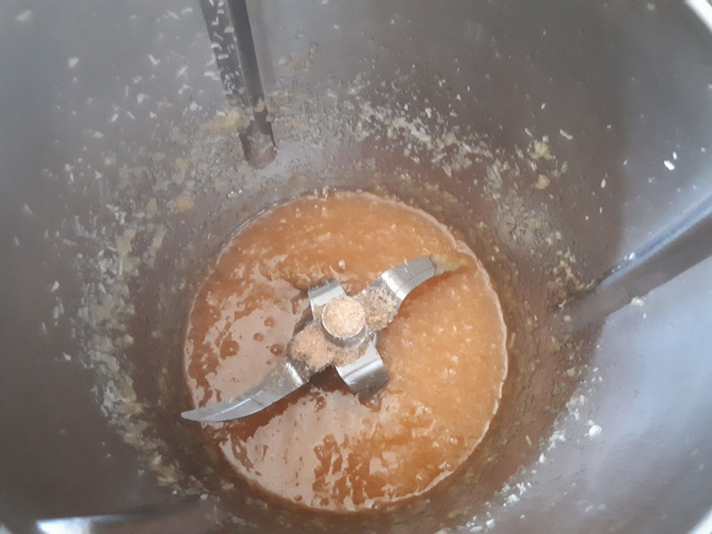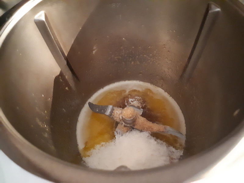 - Mettre votre beurre coupé en morceaux dans le bol puis faire fondre 2 min/90°C/vit2, ajouter le sucre et la noix de coco, mélanger 30sec/vit3.