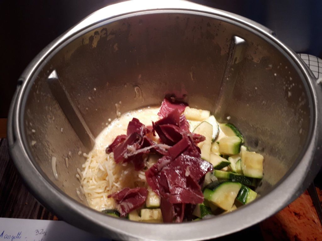 - Mettre dans le bol le beurre puis faire fondre 2min/90°C/Vit2, ajouter la farine, la levure, les œufs, le lait, le sel et le poivre puis mélanger 40sec/Vit4, ajouter, le comté râpé, la courgette, le magret coupé en petits morceaux sans le gras puis mélanger 15sec/Vit2/couteau inversé.
