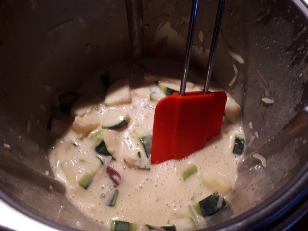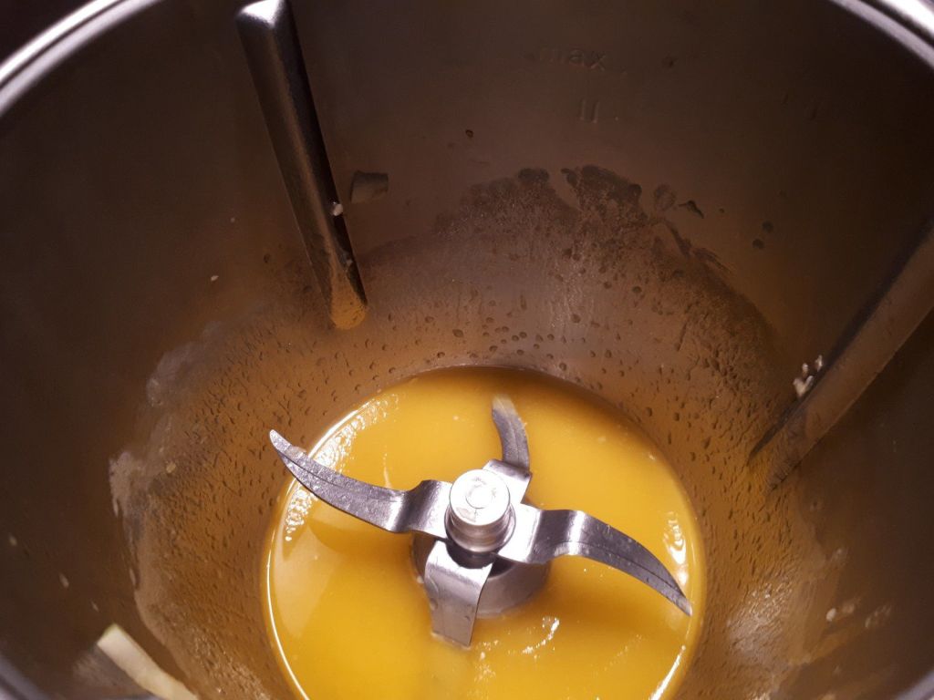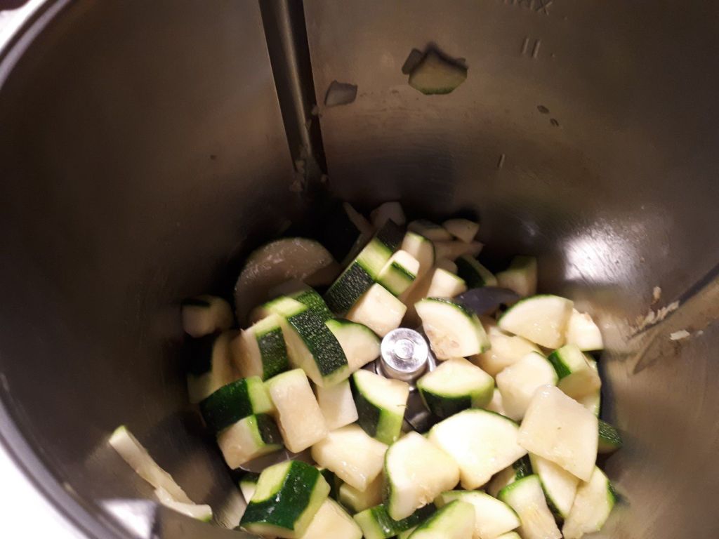 - Éplucher laver et couper la courgette en dés, la mettre dans le bol avec l’huile d’olive, et faire chauffer 7min/90°C/Vit1/couteau inversé. A la sonnerie, égoutter la courgette avec votre panier cuisson au-dessus de votre évier et réserver. Inutile de rincer le bol.