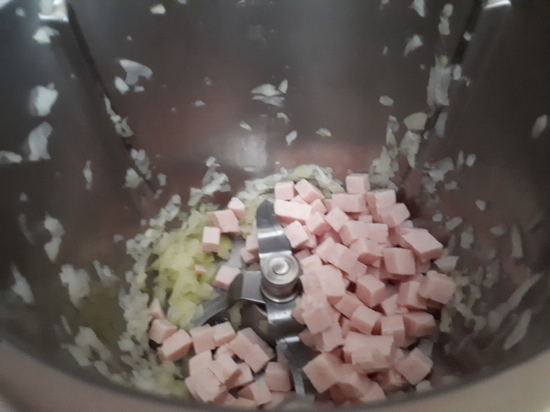 - Éplucher les oignons, les couper en deux, les mettre dans le bol puis mixer 5sec/vit5, mettre l’huile d’olive et faire revenir 4 min/100°C/vit1, ajouter les dés de poulet et faire cuire 2min/100°C/couteau inversé/vit mijotage. Réserver, inutile de rincer le bol.