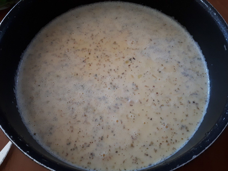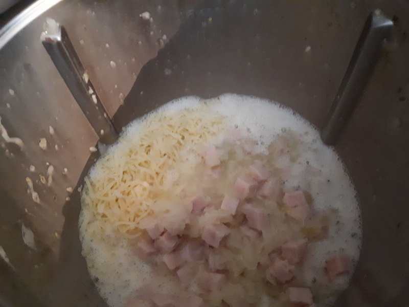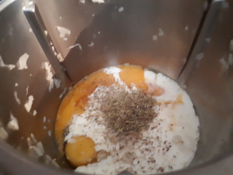 - Mettre les œufs, la crème, le sel et le poivre puis mélanger 20sec/vit4, ajouter le Comté râpé l’origan puis le mélange oignon-poulet mélanger 15sec/couteau inversé/vit2.
