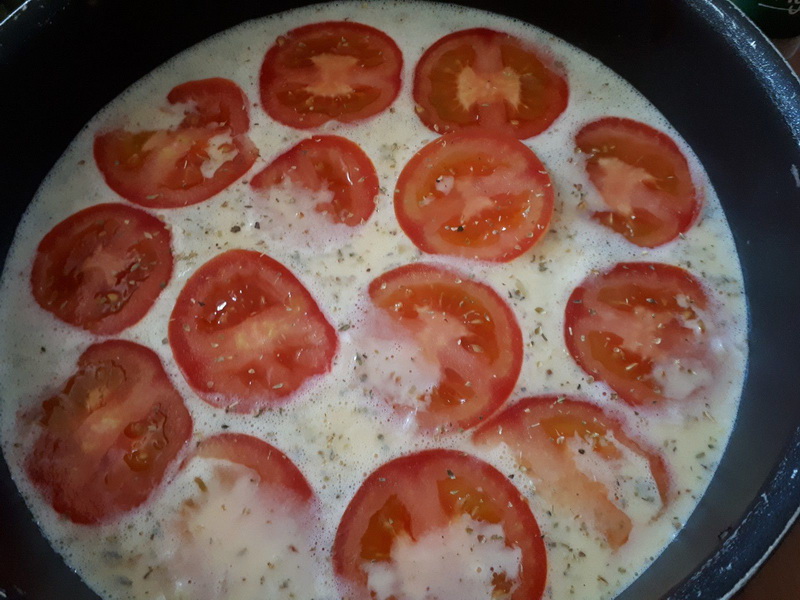 - Incorporer ensuite le mélange oignon-poulet et mélanger à nouveau. Laver et couper les tomates en fines rondelles.