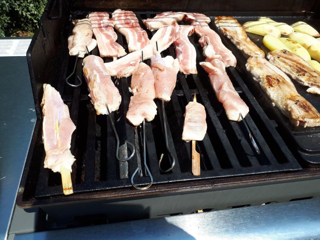 - Brosser la grille de cuisson, faire cuire les brochettes à feu direct vif, couvercle fermé pendant 2-3 minutes, jusqu’à ce qu’elles soient bien grillées en les retournant une fois.