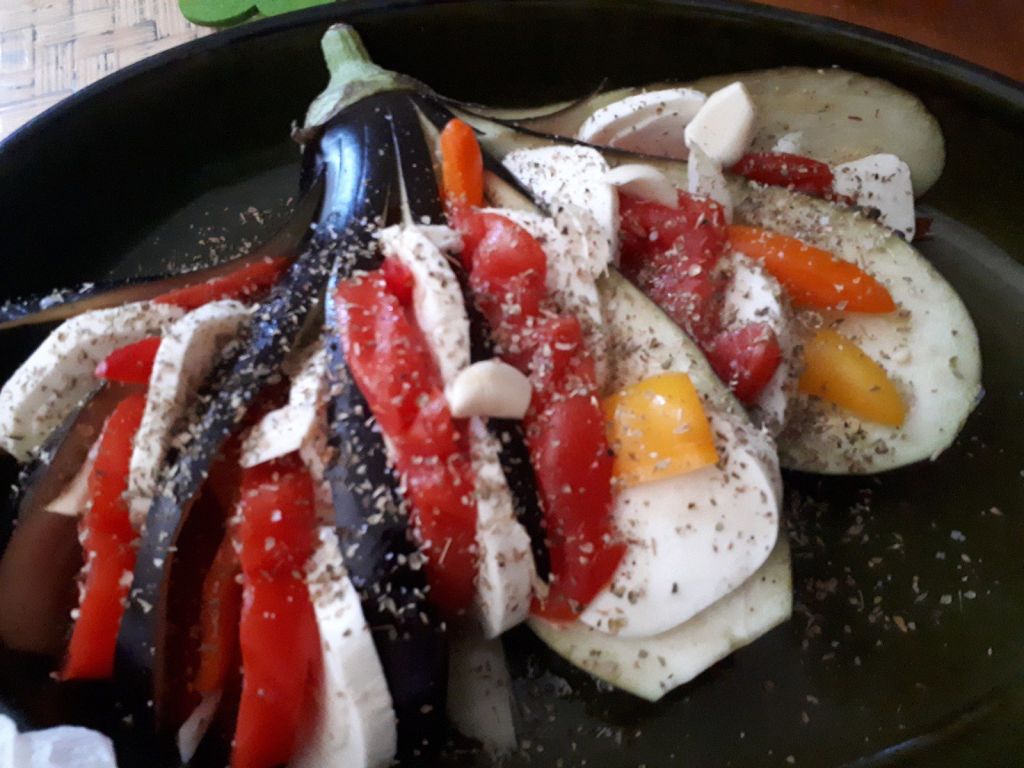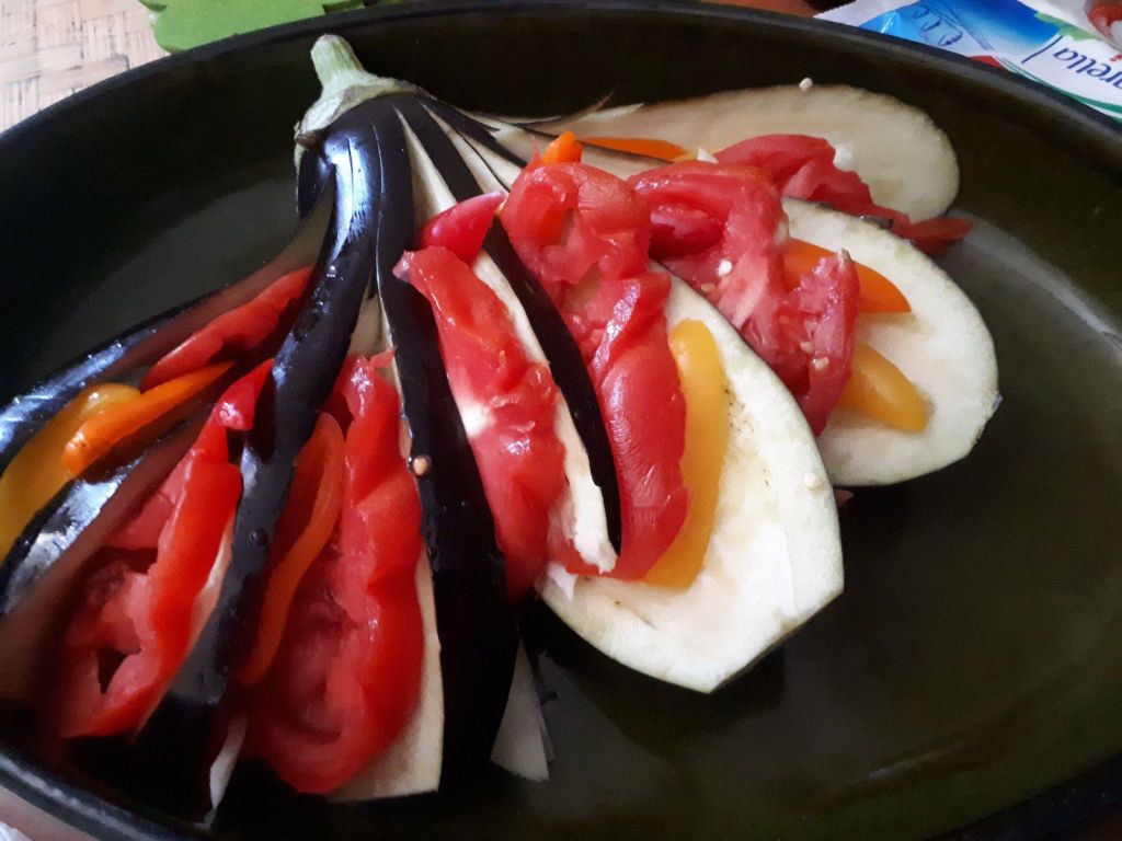 8. Insérer les rondelles de tomates entre les tranches d’aubergines de même que le poivron.