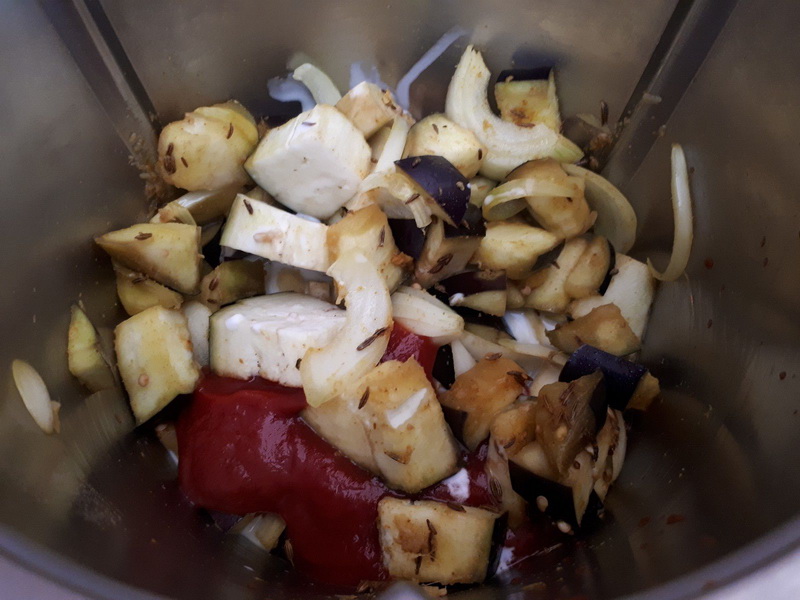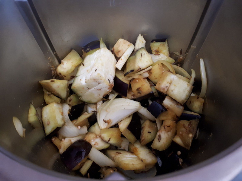 - Ajouter la gousse d’ail hachée, l’oignon épluché et ciselé puis les cubes d’aubergine, faire revenir 3min/100°C/Couteau inversé/vit mijotage sans le gobelet.