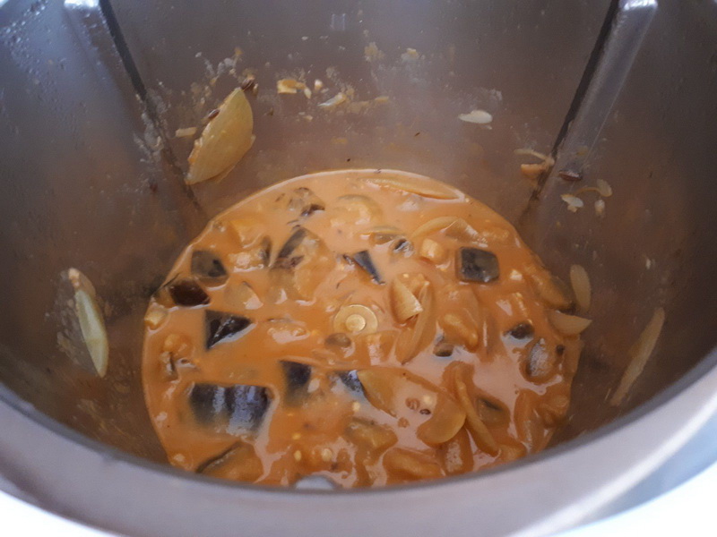 - Ajouter le lait de coco, le lait de soja, le coulis de tomate du sel et du poivre puis poursuivre la cuisson 20min/100°C/couteau inversé/vit mijotage, vous ôterez le gobelet au bout de 10 minutes de cuisson.