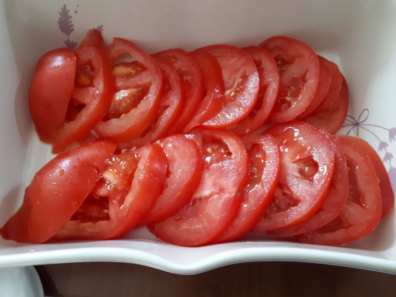 - Laver et couper vos tomates en fines rondelles, les déposer au fond de votre plat à gratin.